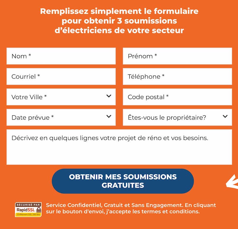 Disponibles dans les différentes régions du Québec Devis par formulaire en ligne ou téléphone. L’électricité est un service essentiel qui conditionne beaucoup de domaines dans notre vie de tous les jours : la cuisine, le jardinage, le bricolage, le transport, les télécommunications, l’éclairage public… Pour jouir pleinement de votre quotidien, faites confiance à nos professionnels spécialisés en électricité qui sauront répondre à vos besoins dans le respect de vos attentes et de votre budget. Et si vous désirez obtenir un devis approximatif, passez-nous un coup de téléphone, nous vous le fournirons gratuitement.